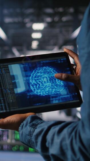 vertical cerca arriba de servidor granja administración utilizando tableta a hacer infraestructura ai máquina aprendizaje automatización. datos centrar software desarrollador haciendo mantenimiento utilizando artificial inteligencia, cámara un Vídeo Pro