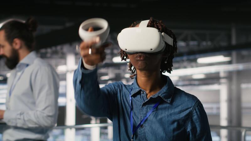 datos centrar programador utilizando virtual realidad tecnología a simular artificial inteligencia neural redes mujer en servidor granja utilizando vr auriculares equipo a supervisar ai sistemas, cámara si Vídeo Pro