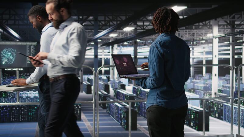 datos centrar software desarrollador en pánico después recepción crítico error surgir en ordenador portátil mostrar. africano americano mujer en servidor cubo alertado por loco causando bajo hardware actuación, cámara un Vídeo Pro