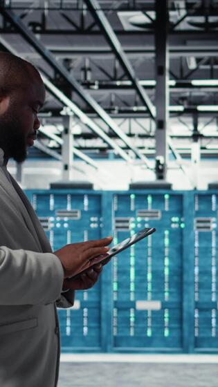 vertical alegre servidor habitación ingeniero solución de problemas backend operaciones utilizando software en tableta. alegre datos centrar programador compilando software parches a reparar loco utilizando dispositivo, cámara un Vídeo Pro