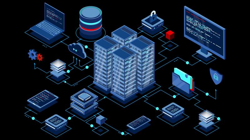 isométrica computadora tecnología animación. cálculo de grande datos centro. nube informática. en línea dispositivos subir y descargar información. transparente antecedentes con alfa. Vídeo Pro