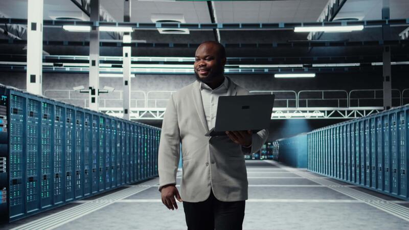 sonriente servidor habitación ingeniero ejecutando mantenimiento en servidor bastidores utilizando software en ordenador portátil. contento datos centrar eso profesional mejorando espada servidor componentes utilizando computadora portátil, cámara un Vídeo Pro