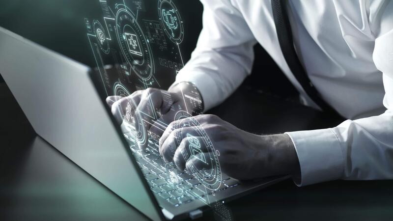 utilizando un cuaderno computadora con un holográfico interfaz. Vídeo Pro