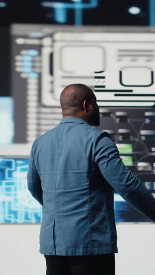 vertical negro profesional software ingeniero programación para tecnología innovación, revisando datos y binario código en el panel. eso especialista examinando programación idioma para transformación. cámara una. Vídeo Pro