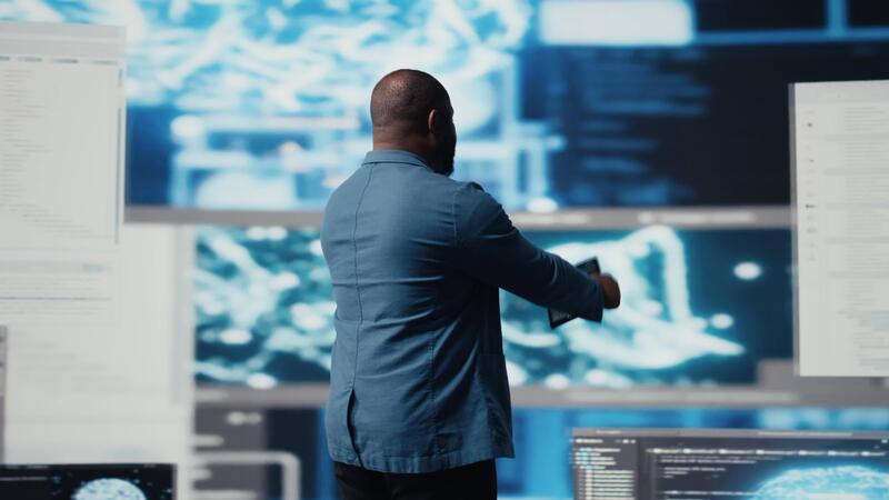 joven profesional ingeniero enfocado en codificación con tableta a un innovación centro, utilizando programación idioma en terminal ventana para automatización. alto tecnología carrera en datos ciencia. cámara una. Vídeo Pro