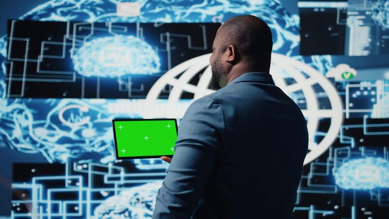 negro eso especialista examinando algorítmico datos siguiente a croma llave, utilizando tableta en un alto tecnología ambiente con futurista digital efectos visuales ai inteligente tecnología y neural redes cámara una. Vídeo Pro