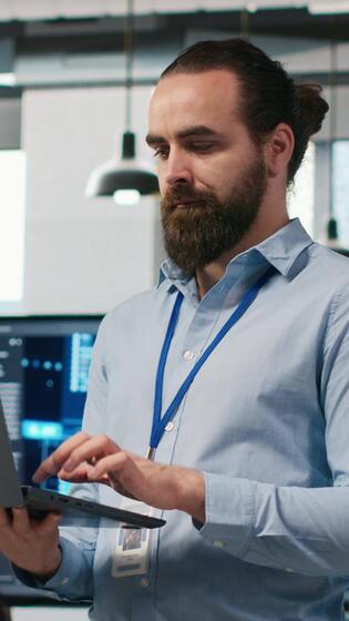 vertical sistema administrador en oficina desarrollando software aplicaciones, integrando ai impulsado automatización en operaciones. eso experto utilizando computadora portátil, depuración aplicaciones a resolver asuntos, cámara un Vídeo Pro