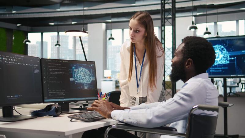 júnior dev y compañero de trabajo en silla de ruedas desarrollando software aplicaciones, optimizando código. hembra técnico y colega con paraplejía en oficina utilizando ai a resolver cuellos de botella, cámara un Vídeo Pro