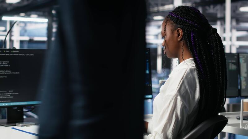 hembra programador en datos centrar comentarios ai diagnóstico, analizando neural red actuación. servidor cubo eso experto optimiza artificial inteligencia sistemas configuración, cámara un Vídeo Pro
