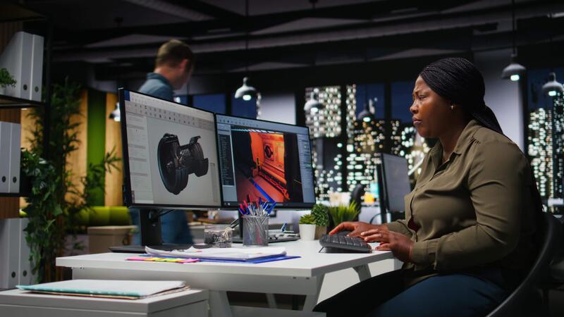 hembra desarrollador crea Marte establecido virtual estación utilizando ai tecnología futurista programa Procesando datos con máquina aprendizaje y automatización a optimizar juego diseño y desarrollo. cámara una. Vídeo Pro