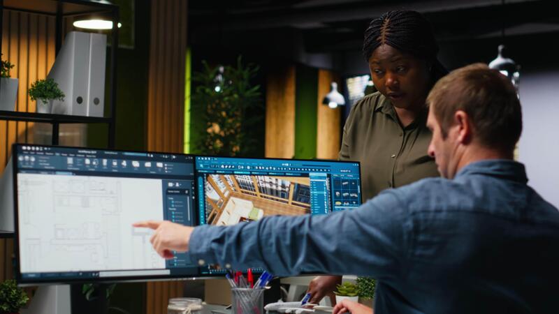 gráfico diseño equipo utilizar arquitectónico software y planos para 3d hacer de hogar interior. programa permite a configurar mueble y otro diseño elementos para un virtual disposición. cámara b. Vídeo Pro