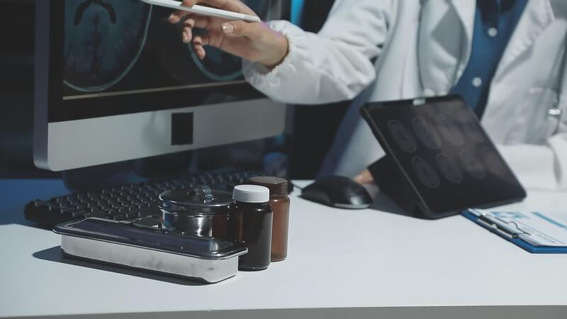 un médico es utilizando un computadora a Mira a un cerebro escanear Vídeo Gratis