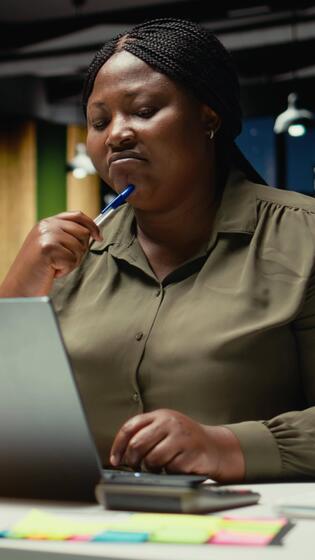 vertical africano americano analista preguntándose acerca de posible soluciones a un dilema con computadora portátil, intenso concentración a evaluar proyecciones con ambos lógico deducción y intuitivo observación. cámara una. Vídeo Pro