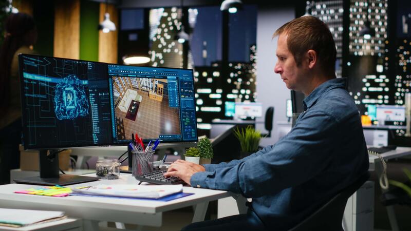 experto desarrollador utilizando ai neural redes en 3d modelado programa a diseño un nuevo Departamento piso plan, virtual asistente ayuda con mueble y diseño en arquitectónico software. cámara b. Vídeo Pro